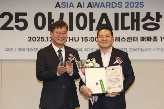 최은수 인텔리빅스 대표(오른쪽)가 18일 서울 중구 프레스센터 매화홀에서 열린 '제3회 아시아AI대상 시상식'에서 중소벤처기업부 장관상을 수상하고 있다. 2025.12.18 강진형 기자