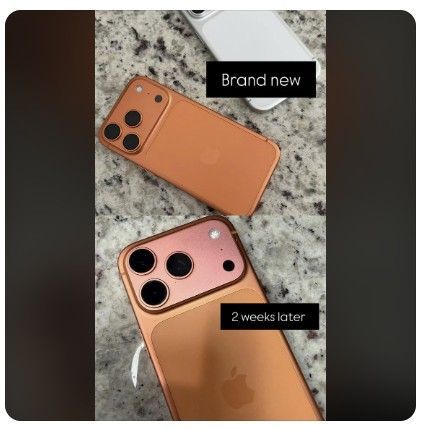 19일 업계와 국내외 온라인 커뮤니티에 따르면 아이폰17 프로·프로맥스의 '코스믹 오렌지' 색상에서 색이 달라졌다는 이용자 불만이 출시 직후부터 최근까지 계속 제기되고 있다. 해외 커뮤니티 레딧에 올라온 사진을 보면, 개봉 당시에는 선명한 오렌지색이던 제품이 약 2주 사용 후 카메라 섬 주변부터 로즈골드나 핑크빛으로 변한 사례가 확인된다. 일부는 변색 범위가 기기 전체로 퍼진 모습도 포착됐다.
