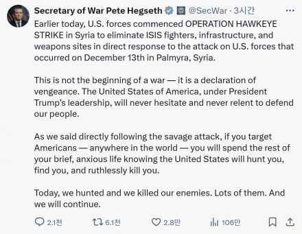 피트 헤그세스 미 국방부(전쟁부) 장관은 이날 자신의 엑스(X·옛 트위터)에 "미군은 시리아 팔미라에서 지난 13일 발생한 미군 대상 공격에 직접 대응으로 ISIS(이슬람국가를 미군이 일컫는 명칭) 전투원, 인프라 및 무기 시설을 제거하기 위한 '호크아이 공습 작전'을 개시했다"고 밝혔다.