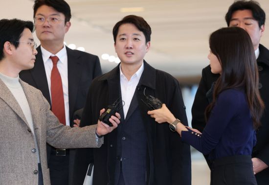 이준석 개혁신당 대표가 21일 윤석열 전 대통령의 공천개입 의혹과 관련한 조사를 받기 위해 서울 종로구 KT 광화문빌딩 웨스트에 마련된 민중기 특별검사팀에 피의자 신분으로 출석하며 취재진의 질문에 답하고 있다. 연합뉴스