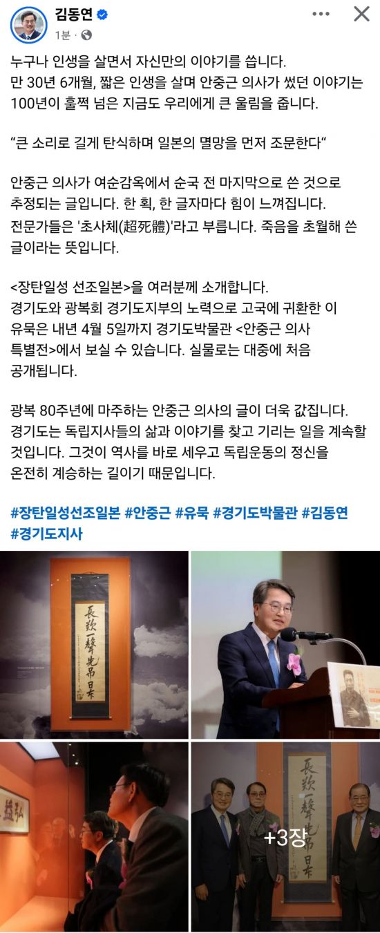 또 "광복 80주년에 마주하는 안중근 의사의 글이 더욱 값지다"며 "경기도는 역사를 바로 세우고 독립운동의 정신을 온전히 계승하기 위해 독립지사들의 삶과 이야기를 찾고 기리는 일을 계속할 것"이라고 밝혔다.