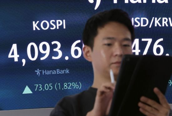 22일 서울 중구 하나은행 딜링룸 현황판에 코스피, 원/달러 환율, 코스닥 등이 표시돼 있다. 이날 오전 9시 3분 현재 코스피는 전장보다 69.15포인트(1.72%) 오른 4,089.70에 거래를 시작해 4100선을 회복하는 등 상승폭을 넓히고 있다.