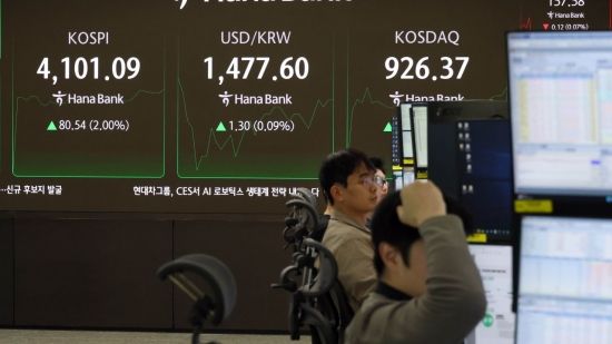 코스피가 장중 4100선을 회복한 가운데 22일 서울 중구 하나은행 딜링룸 현황판에 코스피, 원/달러 환율, 코스닥 등이 표시돼 있다. 이날 오전 9시 3분 현재 코스피는 전장보다 69.15포인트(1.72%) 오른 4,089.70에 거래를 시작해 상승폭을 넓히고 있다.