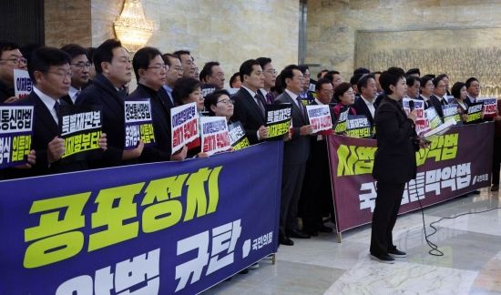 국민의힘 의원들은 이날 오전 국회 본관에서 의원총회를 마친 뒤 본회의장 앞에서 규탄대회를 열고 "(민주당은) 국민의힘뿐 아니라 법원장과 각급 법원의 판사들까지 모두 반대하고 재야 법조계, 학계 심지어 조국혁신당까지도 위헌성에 우려를 표하는 내란전담재판부를 기어이 밀어붙이겠다고 한다"고 강조했다.