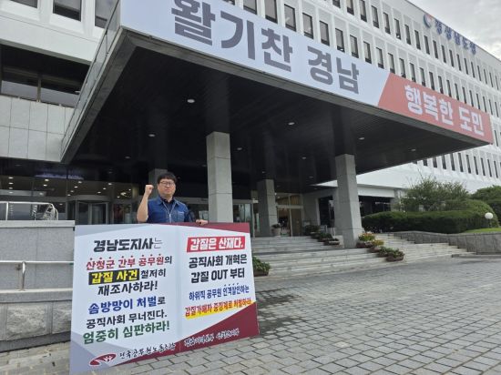 이규필 전국공무원노동조합 경남본부 산청지부장이 경남도청 현관 앞에서 산청군 간부 공무원 갑질 사안에 대한 재조사와 중징계 처벌을 요구하는 1인 시위를 하고 있다. 전공노 경남지부 제공