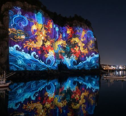 미디어파사드는 건물 외벽이나 구조물, 자연 지형에 영상을 투사해 스크린처럼 활용하는 예술적 미디어 표현 방식으로, 도동항 우안 산책로 일원의 천연 암반 사면을 대형 스크린으로 활용한다.