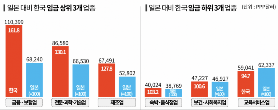 일본과 비교 가능한 11개 업종 중 10개 업종에서 우리 임금이 일본보다 높은 것으로 집계됐다. 특히 금융·보험업(일본 대비 161.8%)과 전문·과학·기술업(130.1%)에서 격차가 컸다. 보건·사회복지업(100.6%)과 교육서비스업(94.7%)은 일본과 유사하거나 소폭 낮았다.