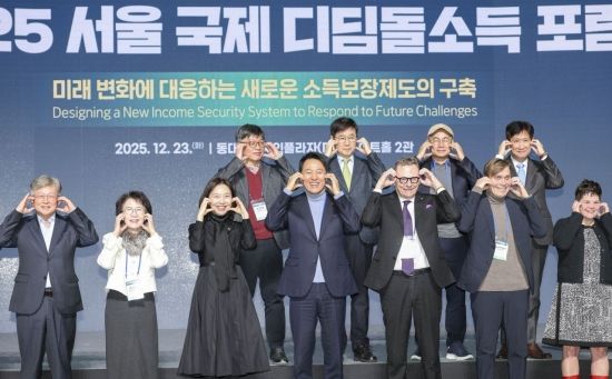 오세훈 서울시장을 비롯한 연사 및 주요내빈들이 23일 서울 중구 동대문디자인플라자에서 열린 '2025 서울 국제 디딤돌소득 포럼'에서 기념촬영 하고 있다.