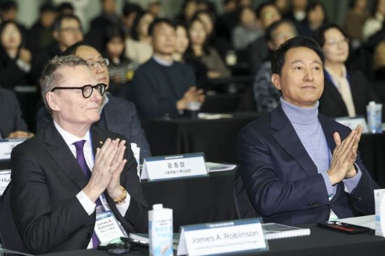 오세훈 서울시장과 2024 노벨 경제학상을 수상한 제임스 로빈슨 시카고대 교수가 23일 서울 중구 동대문디자인플라자에서 열린 '2025 서울 국제 디딤돌소득 포럼'에 참석해 박수 치고 있다.