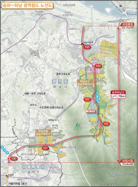 송파하남선 광역철도 건설사업은 서울지하철 3호선 오금역에서 하남시청역까지 총연장 11.7㎞ 구간을 연결하는 광역철도 건설사업이다. 기존 서울 도심과 하남 감일·교산 신도시를 경유하며 2027년 착공, 2032년 개통을 목표로 추진하고 있다.
