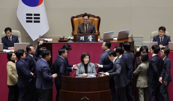 9일 국회에서 열린 본회의에서 나경원 국민의힘 의원이 무제한토론(필리버스터)을 하던 중 우원식 국회의장이 마이크를 끄자 여야 의원들이 발언대로 나와 항의하고 있다. 2025.12.9 김현민 기자
