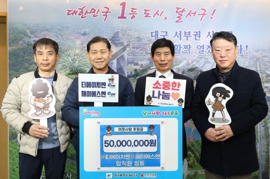 대구 달서구(구청장 이태훈)는 ㈜티에이치엔과 ㈜제이에스엔(대표 이광연, 채승훈)으로부터 이웃사랑 후원금 5000만원을 기탁받았다고 23일 밝혔다.