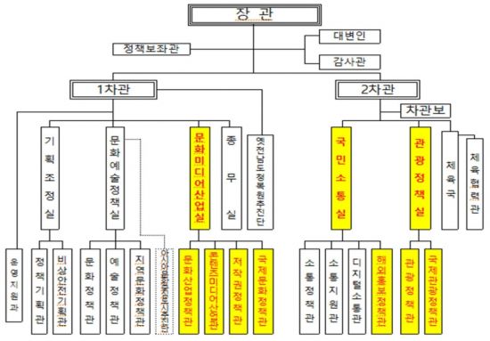 문체부는 과거에도 콘텐츠, 미디어, 저작권 정책을 총괄하는 문화콘텐츠산업실을 운영한 사례가 있다. 문화콘텐츠산업실은 2008년 설치해 2017년까지 운영됐다.