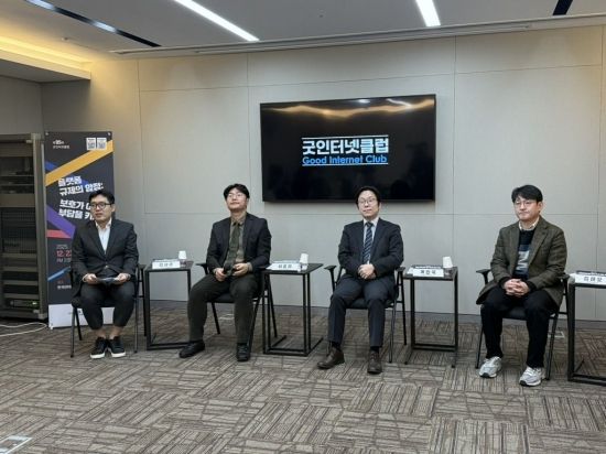 23일 오후 서울 서초구 한국인터넷기업협회에서 진행된 '플랫폼 규제의 함정: 보호가 아니라 부담을 키운다' 좌담회에서 참석자들이 토론하고 있다. 김상준 이화여대 경영학과 교수, 서종희 연세대 법학전문대학원 교수, 계인국 고려대 정부행정학부 교수, 김태오 창원대 법학과 교수. (왼쪽부터) 이명환 기자