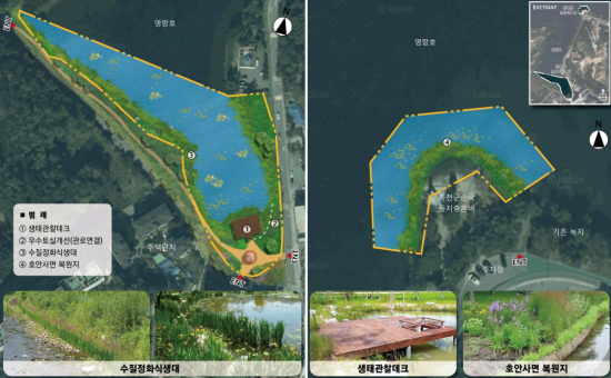 속초시는 퇴적물 저감과 수리·수문 환경 개선을 추진하고, 갈대와 부들 등 자생 수생식물 식재를 통해 수질 정화를 도모할 계획이다. 침식된 호안은 자연형으로 복원하고, 조류와 수생생물이 안정적으로 서식할 수 있는 환경을 마련한다. 또한 흰뺨검둥오리와 쇠백로 등을 생태 지표종으로 설정해 먹이망 복원과 생물다양성 증진을 함께 추진할 방침이다.