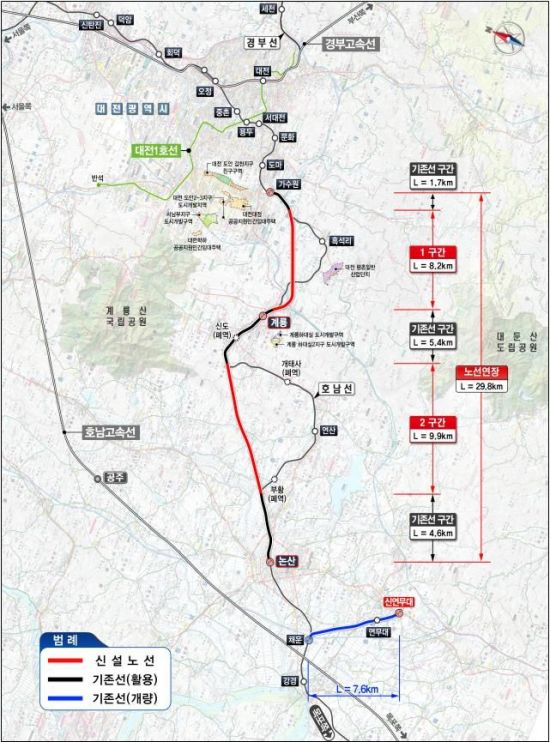 총사업비 9200억원을 들여 대전 가수원역에서 논산역까지 구불구불한 굴곡진 노선을 직선 모양으로 가다듬는다. 기존 노후 시설도 정비해 시속 250㎞ 고속주행이 가능한 선로로 개량하는 국책 사업이다. 기본 및 실시설계를 거쳐 2029년 공사에 들어가 2034년 마쳐 곧바로 개통하는 쪽으로 계획을 짰다.