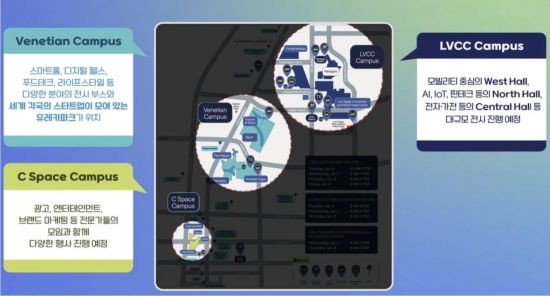 또한 세계 각국의 스타트업이 모여 있는 유레카파크를 비롯해 스마트홈, 디지털 헬스, 라이프스타일 테크 등 여러 콘셉트의 전시가 열리는 베네시안 캠퍼스(Venetian Campus), 엔터테인먼트와 브랜드 마케팅 등 전문가들의 다양한 행사가 진행될 C 스페이스(C Space) 캠퍼스까지 주요 전시 공간을 효율적으로 관람할 수 있도록 동선 가이드도 소개했다.