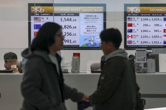 원달러 환율이 1480원을 돌파하며 미국 관세 충격이 있었던 지난 4월9일(1487.6원) 이후 가장 높은 수준을 보이고 있는 24일 인천국제공항 제2여객터미널 환전소에서 달러 매입 가격이 표시돼 있다. 2025.12.24 강진형 기자