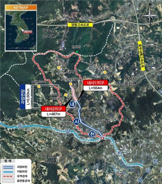 정비사업은 여주시 흥천면 내사리 일원 총연장 0.6㎞ 구간의 하천을 정비(하폭 6~14 → 15~20m)하는 것으로 ▲축제공(제방 쌓기) 1.05㎞ ▲교량 3개 설치 등이 포함된다.