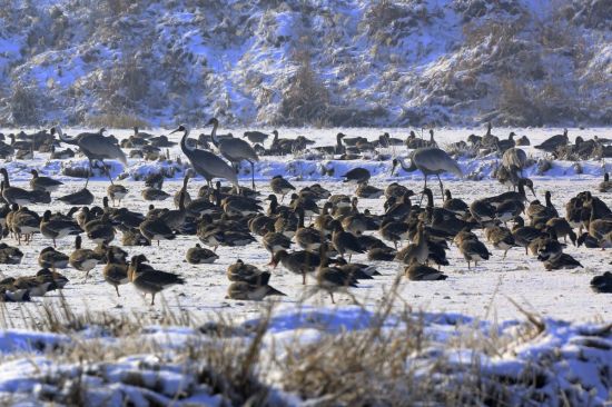 개리는 장항습지를 중간 기착지로 삼는 겨울 철새로, 기러기류 중 가장 긴 부리와 목을 지녔다. 갯벌에 군락을 이룬 새섬매자기와 곡물을 먹는 개리는 장항습지의 안정된 먹이 환경을 보여준다. 이 밖에도 큰기러기, 큰고니 등 대형 조류가 해마다 이곳을 찾는다.