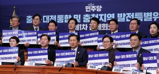 24일 여의도 국회에서 민주당은 '대전·충남 통합 및 충청지역 발전 특별위원회 출범식 및 1차 전체회의'를 열었다. 출범식에 참석한 정청래 민주당 대표는 대전·충남 통합과 관련해 "국가 균형발전의 본격적인 시작"이라며 "이미 여러 행정절차가 진행돼 국회에서 법이 통과되면 빠르면 한 달 안에도 (통합이) 가능한 일"이라고 밝혔다.