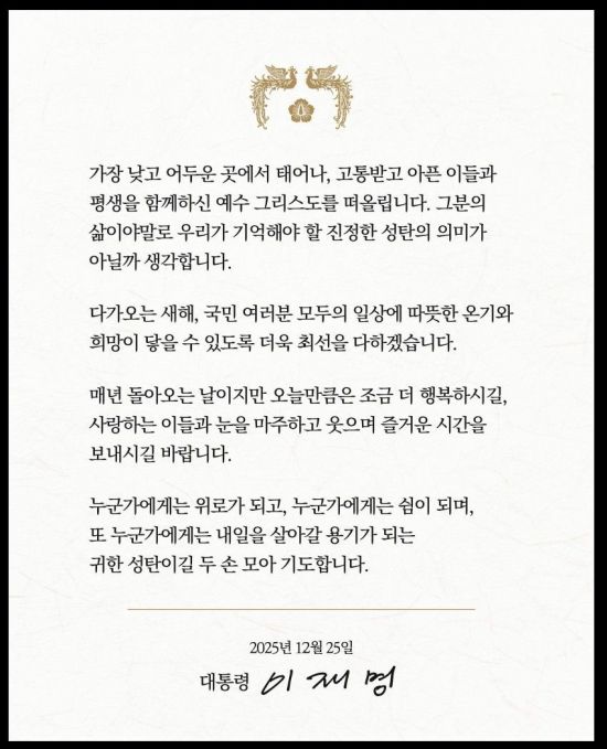 아울러 이 대통령은 "누군가에게는 위로가 되고, 누군가에게는 쉼이 되며, 또 누군가에게는 내일을 살아갈 용기가 되는 귀한 성탄이길 두 손 모아 기도한다"고 했다.