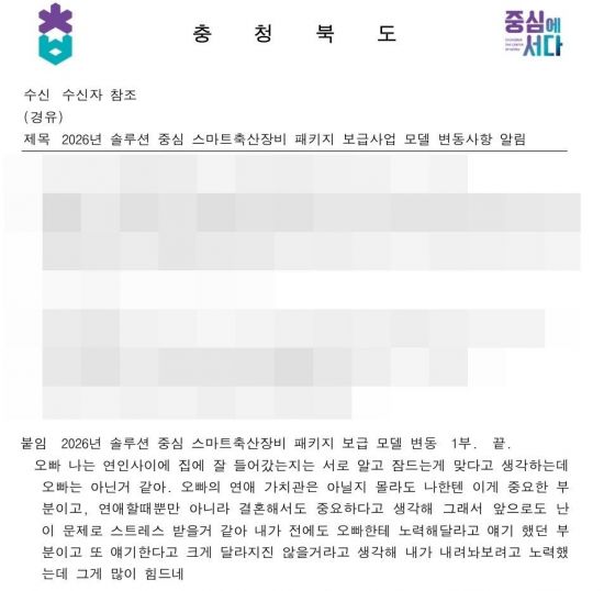 25일 충북도 등에 따르면 도는 전날 내년도 스마트 축산장비 패키지 보급 사업과 관련한 공문 '2026년 솔루션 중심 스마트 축산장비 패키지 보급 사업 모델 변동 사항 알림'을 도내 11개 시·군에 배포했다고 이날 연합뉴스가 보도했다. 문제는 해당 공문 하단 '붙임' 부분에 사업과 동떨어진 연인 간의 대화 내용이 적혀 있었다는 것이다.