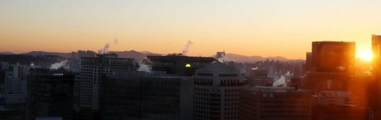 체감온도가 영하 18도까지 떨어지며 올 겨울들어 가장 추운 날씨를 보인 26일 서울 종로 한 건물에서 바라본 도심의 빌딩들이 난방을 가동하며 수증기를 내뿜고 있다.