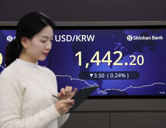26일 서울 외환시장에서 원·달러 환율은 오후 3시30분 기준 전 거래일 대비 9.5원 내린 1440.3원을 기록했다. 개장 전까지만 해도 일부 되돌림이 있을 수 있다는 시각도 있었지만, 원·달러 환율은 이날 추가로 하락해 주간 거래를 마감했다. 지난 24일에 이어 이틀 연속 1440원대다.