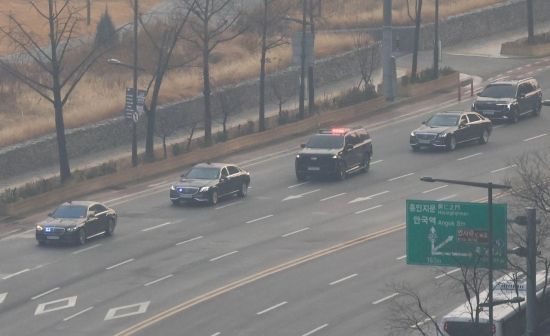 이재명 대통령이 탄 차량 행렬이 29일 오전 서울 경복궁 인근을 지나 청와대로 향하고 있다. 대통령이 청와대로 출근하는 것은 문재인 전 대통령이 마지막으로 출근한 퇴임일인 2022년 5월 9일로부터 3년 7개월만이다.