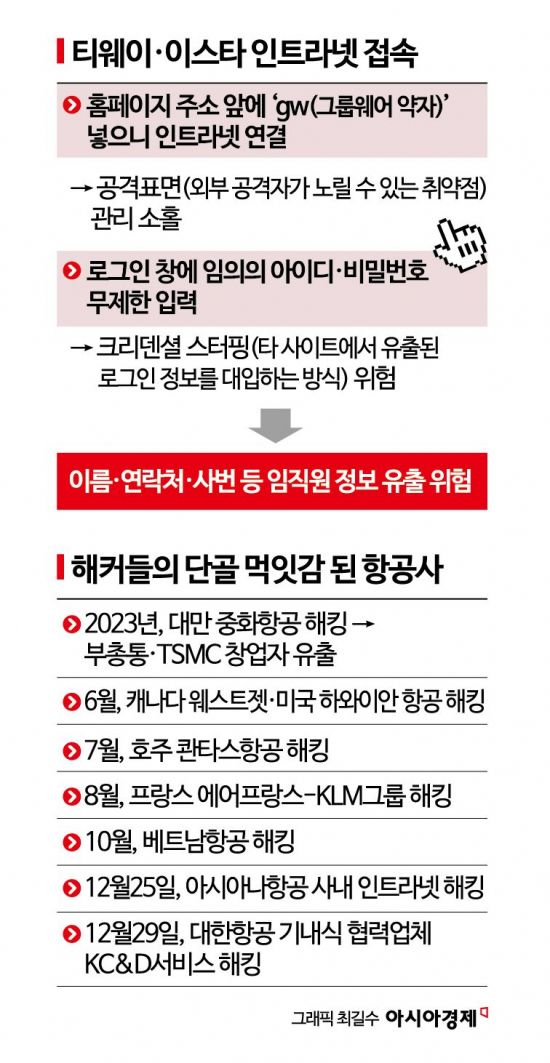 황석진 동국대 국제정보보호대학원 교수는 "아이디와 비밀번호를 여러 사이트에서 동일하게 쓰는 경우가 많기 때문에 보안 수준이 낮은 사이트에서 이미 로그인 정보가 유출된 경우 사내 인트라넷까지 해킹당할 위험이 있다"며 "항공사의 경우 사내 인트라넷에 고객 정보를 비롯한 다양한 데이터가 올라올 수 있어서 해커들이 타깃으로 삼을 가능성이 크다"고 했다.