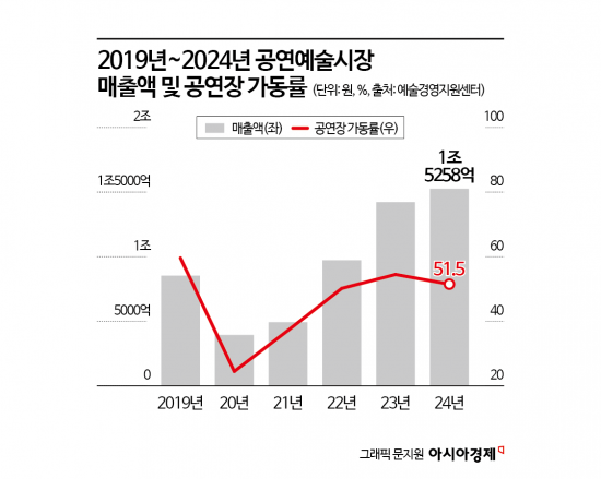 2024년 공연장 가동률은 51.5%로, 전년(54.5%)보다 3%포인트 하락했다. 시장 매출 가운데 티켓판매액이 43.8%로 가장 큰 비중을 차지했으며, 작품판매수입 및 공연출연료 21.6%, 공연장 대관수입 17.9%, 공연 이외 사업수입 7.7%, 기타수입 4.9%, 기타 공연사업 수입 4.1% 순으로 집계됐다.