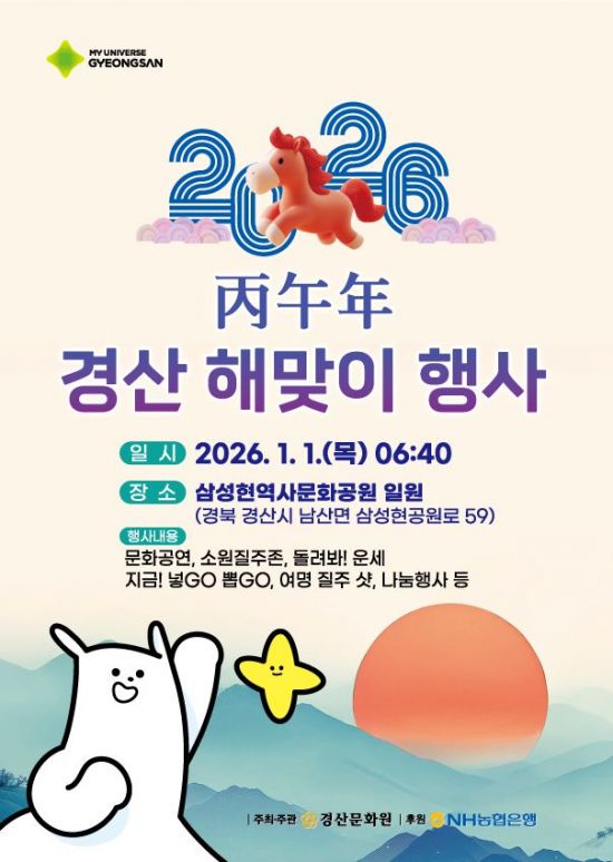 경산시(시장 조현일)는 2026년 1월 1일 삼성현역사문화공원 야외무대 일원에서 '2026 병오년 경산 해맞이 행사'를 개최한다고 밝혔다.