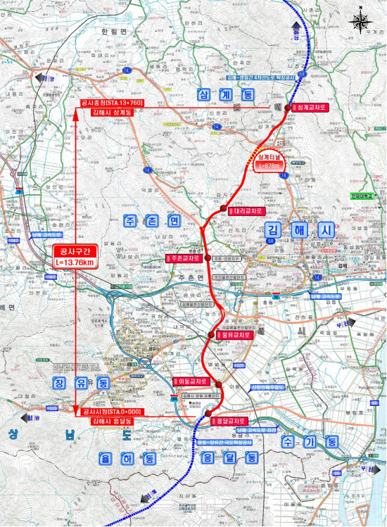 부산지방국토관리청에서 추진 중인 '국도 58호선 무계~삼계 대체 우회도로 개설공사'는 응달동에서 삼계동까지 총 13.76㎞를 연결하는 것으로 총사업비 4801억원이 투입됐다.