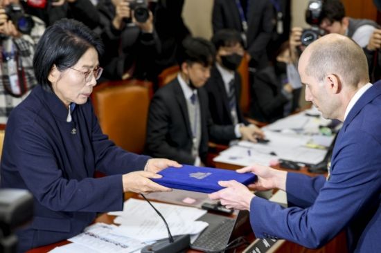헤롤드 로저스 쿠팡 대표이사(오른쪽)사가 29일 서울 여의도 국회에서 열린 '쿠팡 연석 청문회'에 참석해 증인선서를 마친 뒤 최민희 국회 과학기술정보방송통신위원장에게 증인선서문을 전달하고 있다.