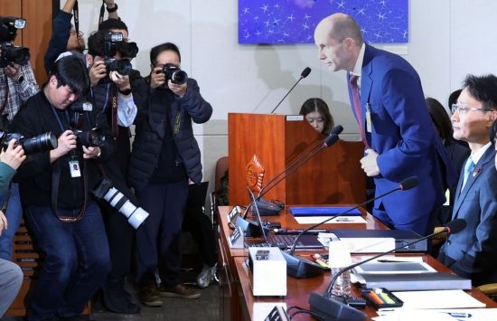 30일 국회에서 열린 '쿠팡 침해사고 및 개인정보 유출, 불공정 거래, 노동환경 실태 파악과 재발방지 대책 마련을 위한 청문회'에서 해롤드 로저스 쿠팡 대표가 의원들에게 인사하고 있다.