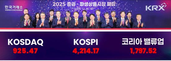 정은보 한국거래소 이사장(정중앙)이 임원들과 함께 30일(화) 한국거래소 부산 본사에서 '2025년 증권·파생상품시장 폐장식'을 개최하고, 종가 지수를 바탕으로 단체 기념 촬영을 하고 있다.