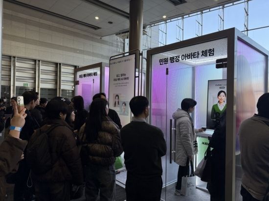 30일 서울 코엑스 오디토리움 앞 전시장 네이버클라우드의 부스에 마련된 마음케어 아바타와 민원행정 아바타 체험 부스. 하이퍼클로바X를 기반으로 한 대화형 체험이 가능하다. 사진=이명환 기자