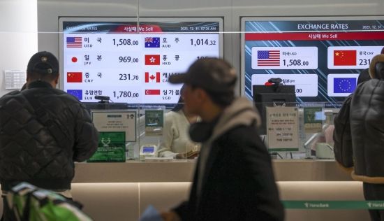 원달러 환율이 정부의 강력한 시장 개입으로 1440원대까지 내린 가운데 31일 인천국제공항 제1여객터미널 환전소 전광판에 달러 매입 가격이 표시돼 있다.