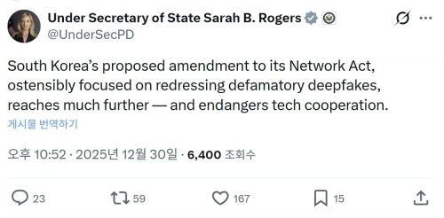 사라 로저스 미 국무부 공공외교 차관은 30일(현지시간) 엑스(X·옛 트위터)에 "한국의 네트워크법(Network Act) 개정안은 표면적으로는 명예를 훼손하는 딥페이크 문제를 바로잡는 데 초점을 둔 것처럼 보이지만, 실제로는 훨씬 더 광범위한 영향을 미치며 기술 협력을 위태롭게 한다"고 적었다.