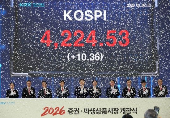 새해 첫 거래일인 2일 코스피가 장중 사상 최고치를 갈아치운 가운데 서울 여의도 한국거래소에서 열린 ‘2026년 증권·파생상품시장 개장식’에서 이억원 금융위원장, 이찬진 금융감독원장, 정은보 한국거래소 이사장 등 내빈들이 코스피 시황판 앞에서 올해 첫 개장을 알리고 있다. 이날 코스피는 10시 12분 기준 전 거래일보다 21.40포인트(0.51%) 오른 4235.57을 기록했다.