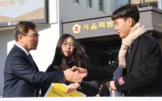 정근식 서울시교육감이 5일 서울 중구 서울시의회 앞에서 열린 '학생인권조례 폐지안 재의요구 기자회견'에 참석, 기자회견에 참석한 학생들과 인사를 나누고 있다. 정 교육감은 이 자리에서 학생인권조례 폐지는 학생의 기본권 보호 체계를 전면 해체하는 중대한 위헌, 위법행위라고 주장하며 서울시의회가 학생인권조례 폐지안을 통과시킨 데 대해 재의를 요구했다.