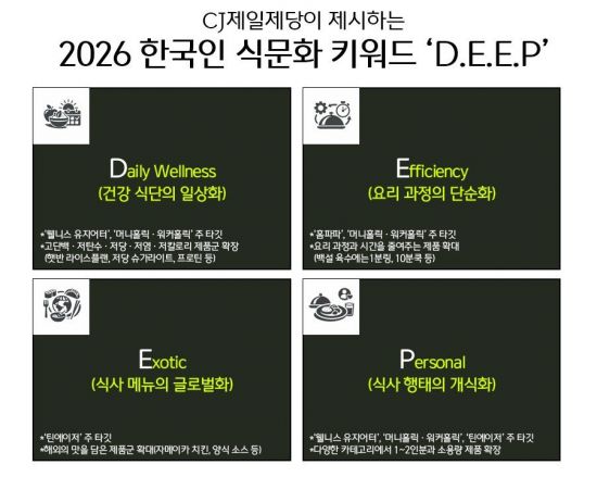 CJ 제일제당은 이같은 조사를 토대로 올해 식문화 키워드 'D.E.E.P'를 제시했다. '딥(D.E.E.P)'은 건강 식단의 일상화(Daily Wellness), 요리 과정의 단순화(Efficiency), 식사 메뉴의 글로벌화(Exotic), 식사 행태의 개식화(個食化·Personal)를 뜻한다.