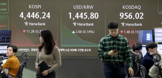 코스피 지수가 전 거래일 대비 12.33포인트 하락한 4445.19에 장을 시작한 6일 서울 중구 하나은행 딜링룸 전광판에 국내증시 지수가 표시돼 있다.