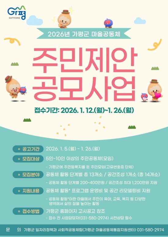 경기 가평군이 주민 주도의 마을공동체 활성화를 위해 '2026년 가평군 마을공동체 주민제안 공모사업'을 추진한다.