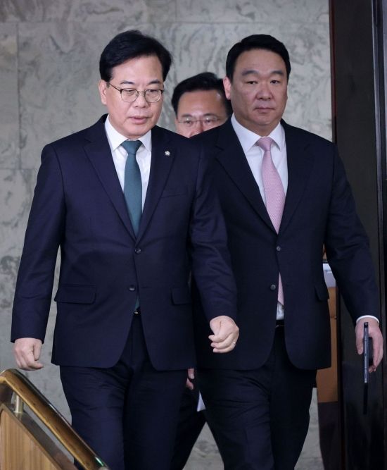 송언석 국민의힘 원내대표가 6일 국회에서 열린 원내대책회의에 참석하고 있다.