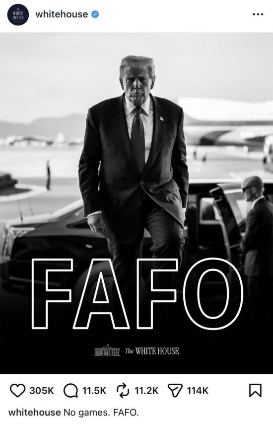 백악관은 마두로 체포 작전이 이뤄진 지난 3일(현지시간) 엑스(X·옛 트위터)와 인스타그램에 트럼프 대통령이 결연한 표정으로 계단을 오르는 모습의 흑백 사진을 올렸다. 사진에는 'FAFO'라는 문구가 큰 글씨로 새겨져 있다. FAFO는 '까불면 다친다'(F**k Around and Find Out)라는 의미의 미국 속어다. 백악관은 이 사진과 함께 '더 이상 게임은 없다. FAFO'라는 글을 함께 올렸다.
