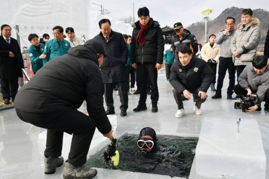 김 지사는 축제장 내 얼음 두께와 빙질 상태, 수질 검사 결과를 비롯해 현장운영상황실 운영체계와 소방안전대책본부 운영 상황 등을 차례로 확인했다. 특히 1일 최대 6만5000명의 방문객이 예상되는 대규모 겨울축제인 만큼, 다중운집에 대비한 치안대책과 안전관리 인력 배치, 비상상황 발생시 대응 체계 전반을 중점적으로 점검했다.