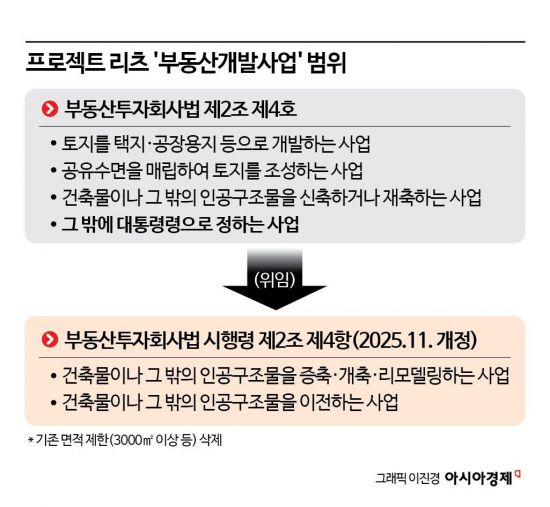 23일 부동산투자회사법 시행령에 따르면 프로젝트 리츠의 투자 범위를 넓게 열어두면서도 핵심 개념은 모호하게 남겨뒀다. 지난해 11월 국토교통부는 시행령 개정을 통해 부동산개발사업에 '건축물이나 그 밖의 인공구조물을 증축 또는 개축, 리모델링, 이전'을 추가했다. 기존 증·개축 사업의 면적 기준을 삭제하고 리모델링을 새로 포함했지만 구체적으로 어디까지를 '개발'로 볼지는 여전히 해석에 맡겨져 있다.