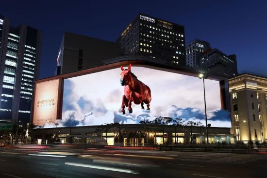 이번 미디어아트는 '천마도'에서 영감을 얻어 구름 사이로 말이 등장해 힘차게 달리는 모습을 담았다. 입체감과 현장감을 표현하는 아나몰픽 기법을 적극 활용해 몰입도를 높였다.